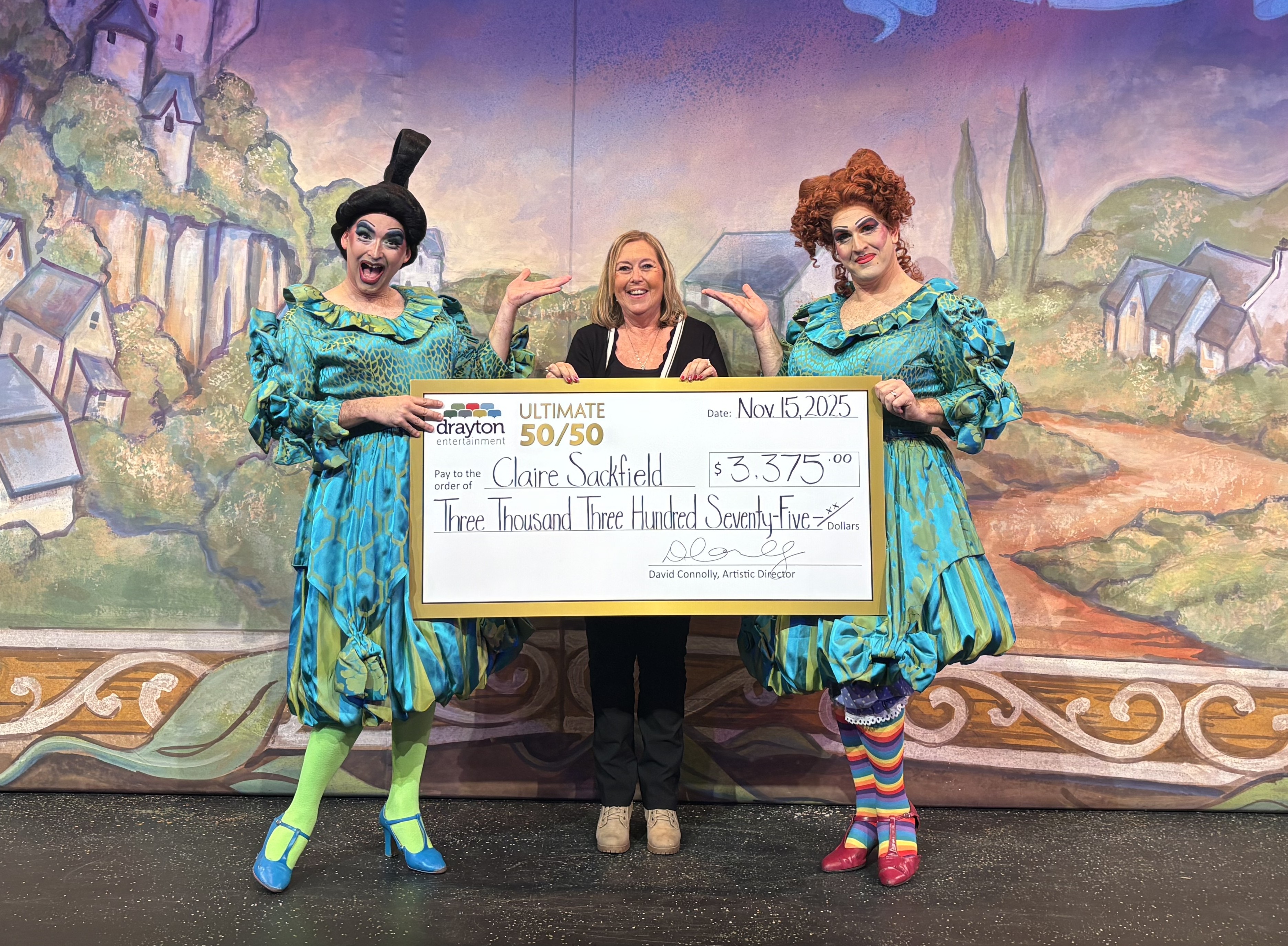 After attending an evening performance of Cinderella: The Panto with her grandkids, Claire’s evening went from magical to downright enchanted when she was invited on stage to receive her winning cheque, presented by none other than the wickedly wonderful stepsisters, Revolta and Atrocia!